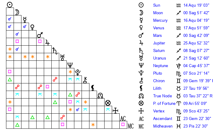 | Moon | 0 Sagittarius 57 | 20 Aries 6 | 7 Taurus 25 |