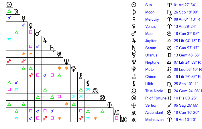 | Moon | 26 Scorpio 12 | 4 Capricorn 46 | 23 Libra 1 |