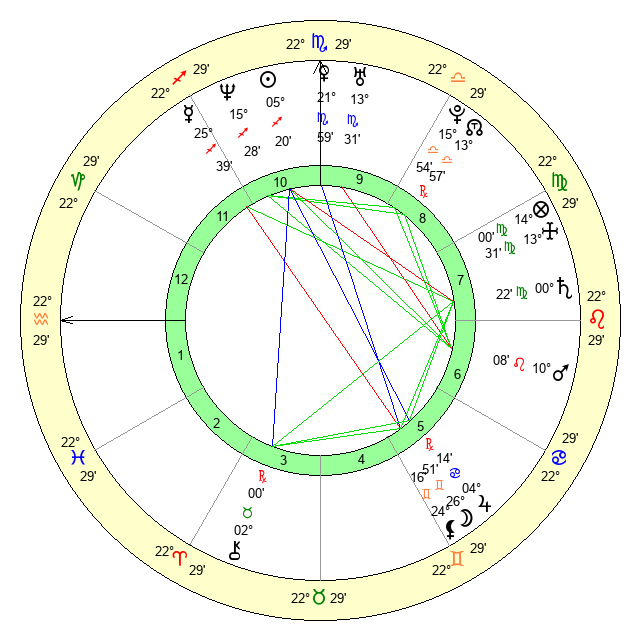 | Saturn | 0 Virgo 45 | 12 Pisces 45 | 29 Leo 58 |