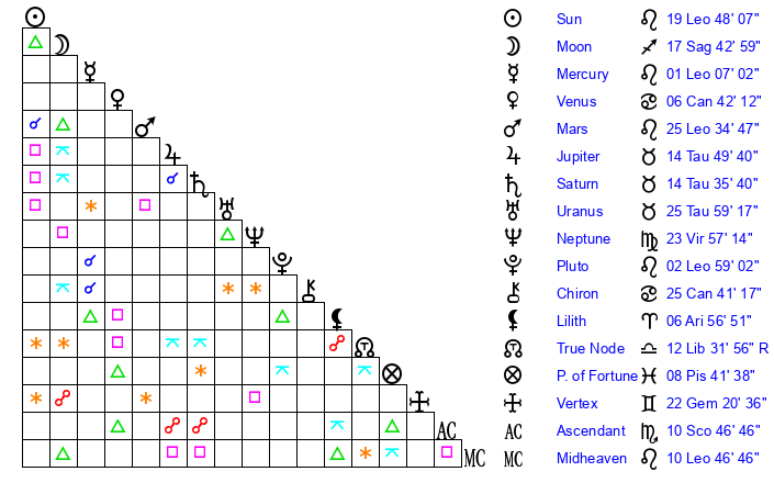 | Pluto | 2 Leo 59 | 2 Aquarius 9 | 4 Leo 20 |