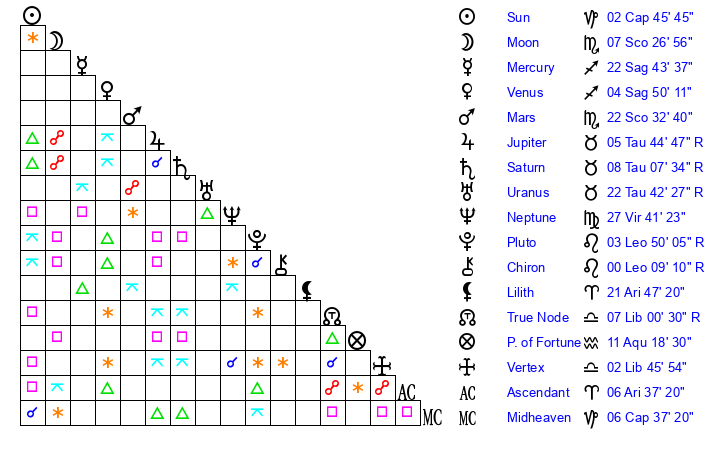 | Mars | 22 Scorpio 33 | 7 Capricorn 7 | 20 Capricorn 28 |