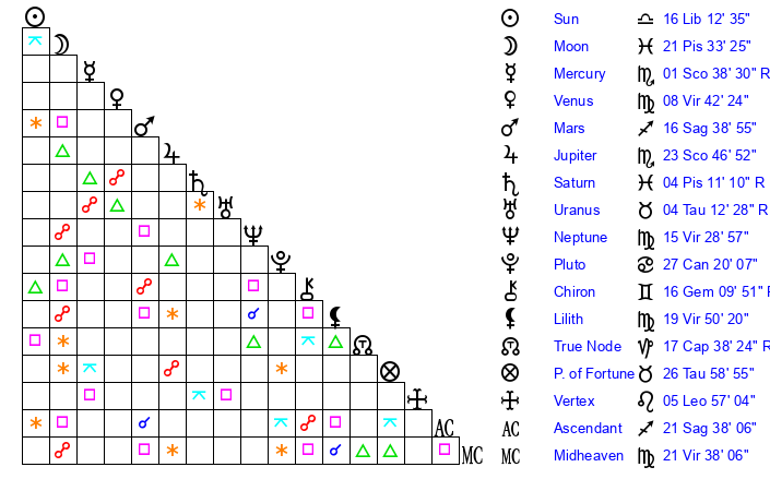 | Mars | 16 Sagittarius 38 | 12 Scorpio 21 | 25 Aquarius 12 |