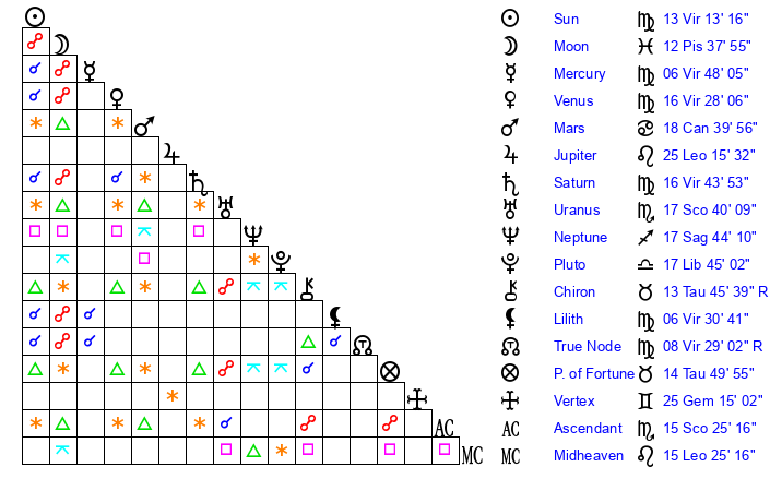 | Saturn | 17 Virgo 5 | 29 Pisces 31 | 22 Virgo 38 |
