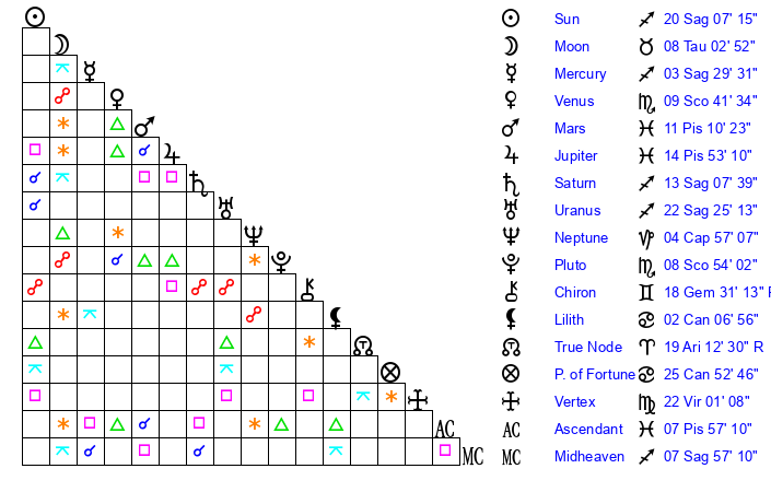 | Uranus | 22 Sagittarius 26 | 24 Taurus 15 | 24 Sagittarius 39 |
