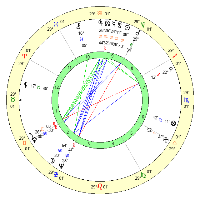 | Moon | 20 Cancer 55 | 12 Aquarius 20 | 28 Cancer 41 |