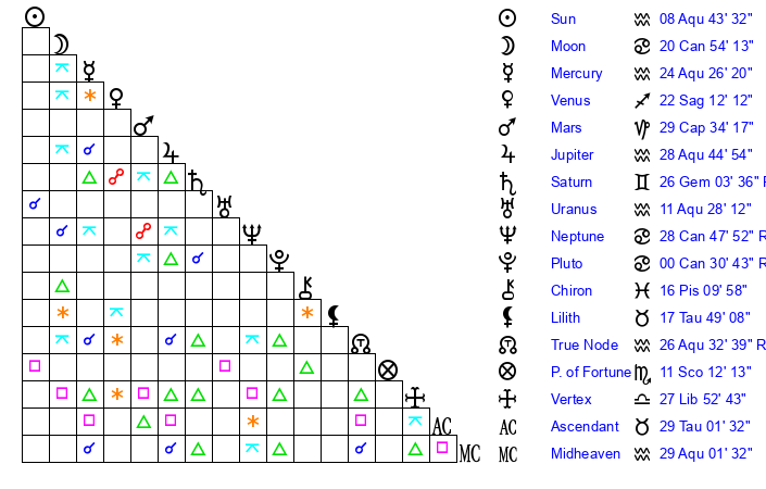 | Moon | 20 Cancer 55 | 12 Aquarius 20 | 28 Cancer 41 |