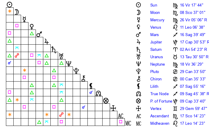 | Sun | 16 Virgo 17 | 16 Virgo 59 | 13 Sagittarius 52 |