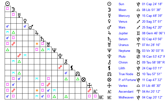 | Sun | 1 Capricorn 24 | 2 Capricorn 22 | 7 Aries 18 |