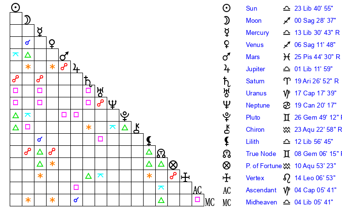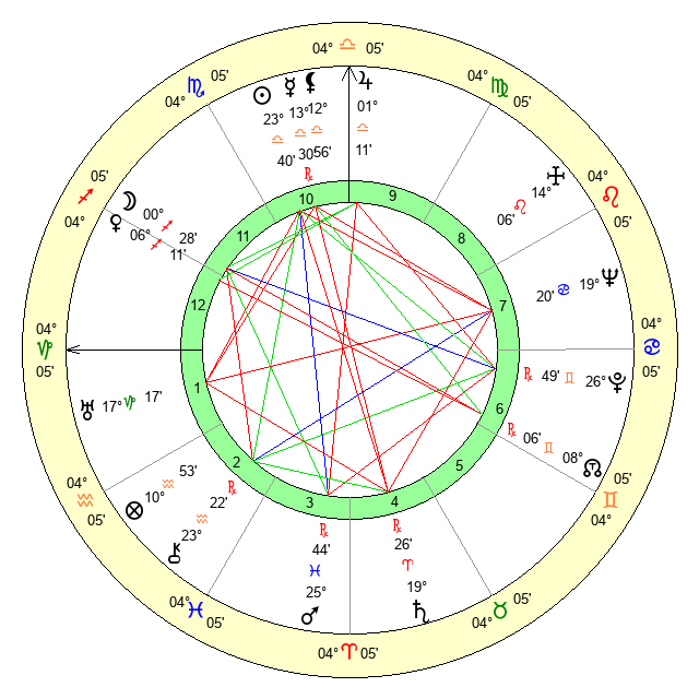 | Sun | 23 Libra 41 | 24 Libra 34 | 21 Aquarius 6 |