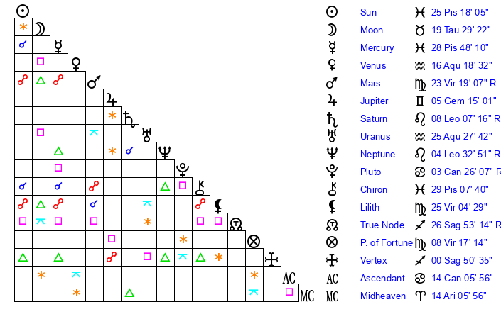 | Moon | 19 Taurus 27 | 22 Libra 44 | 13 Aries 32 |