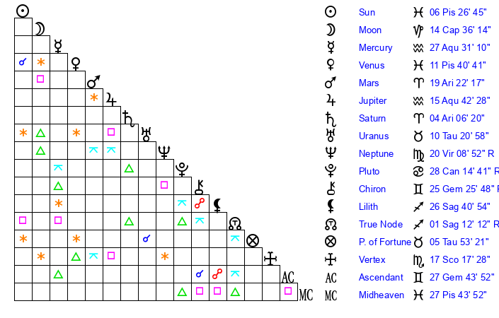 | Sun | 6 Pisces 26 | 7 Pisces 20 | 1 Gemini 53 |