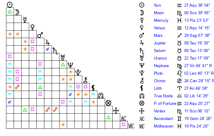 | Sun | 27 Aquarius 39 | 28 Aquarius 16 | 20 Taurus 35 |