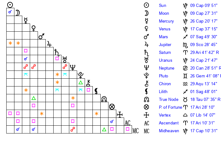 Moon | 9 Capricorn 31 | 19 Capricorn 58 | 7 Pisces 41 |