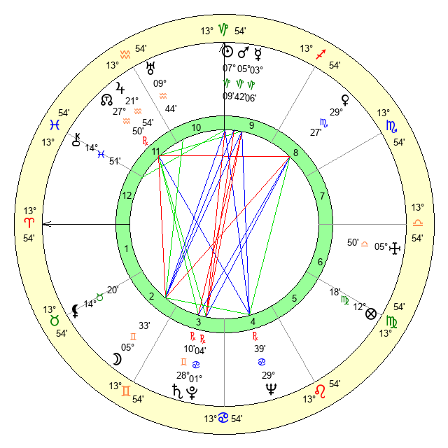 | Moon | 5 Gemini 33 | 23 Sagittarius 43 | 13 Gemini 49 |