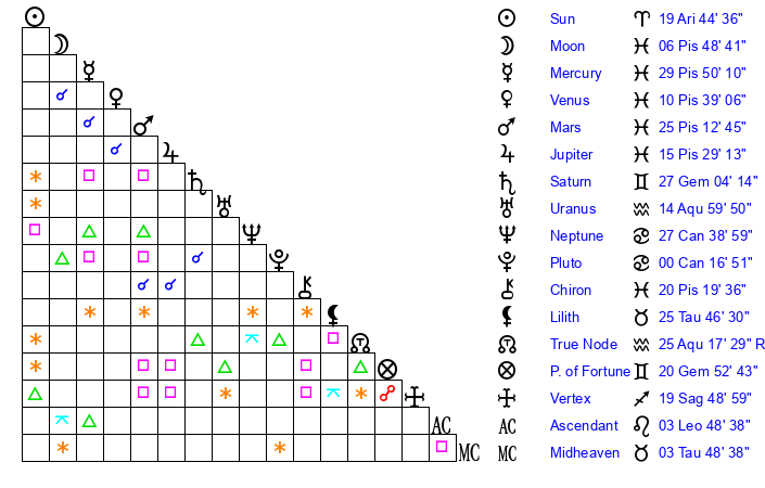 | Sun | 19 Aries 44 | 21 Aries 4 | 5 Leo 28 |