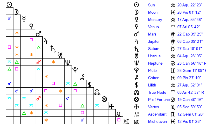 Sun | 20 Aquarius 22 | 21 Aquarius 12 | 10 Gemini 34 |