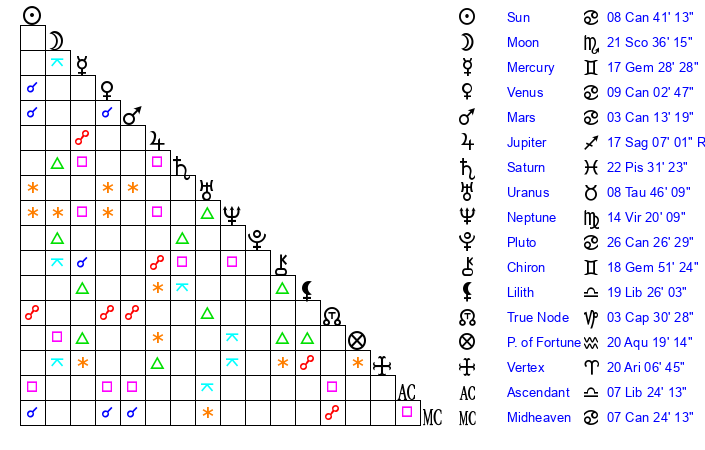 | Pluto | 26 Cancer 26 | 3 Aquarius 8 | 28 Cancer 32 |