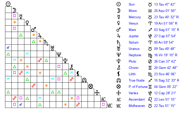 | Neptune | 16 Virgo 18 | 1 Aries 12 | 17 Virgo 13 |