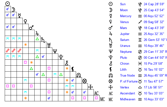 | Sun | 24 Capricorn 29 | 25 Capricorn 48 | 14 Taurus 6 |