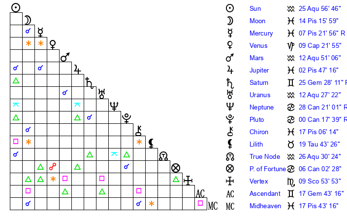 | Sun | 25 Aquarius 56 | 27 Aquarius 16 | 13 Gemini 56 |