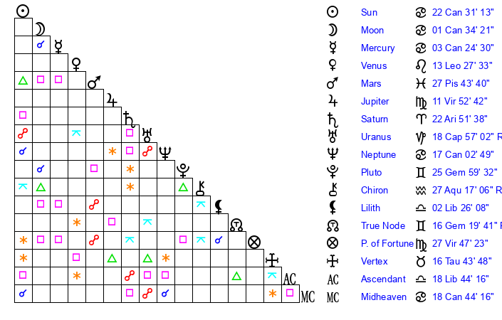 | Moon | 1 Cancer 25 | 23 Pisces 19 | 27 Virgo 54 |