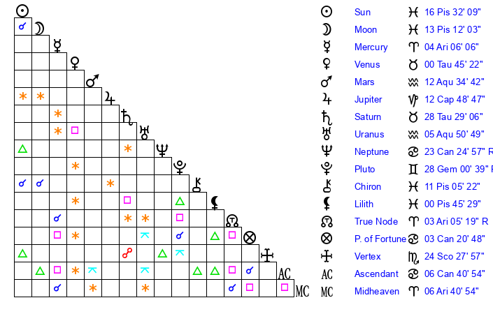 Sun | 16 Pisces 32 | 17 Pisces 22 | 5 Cancer 24 |