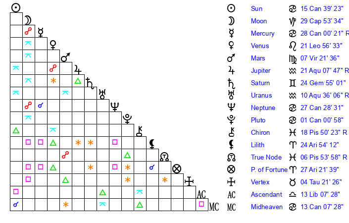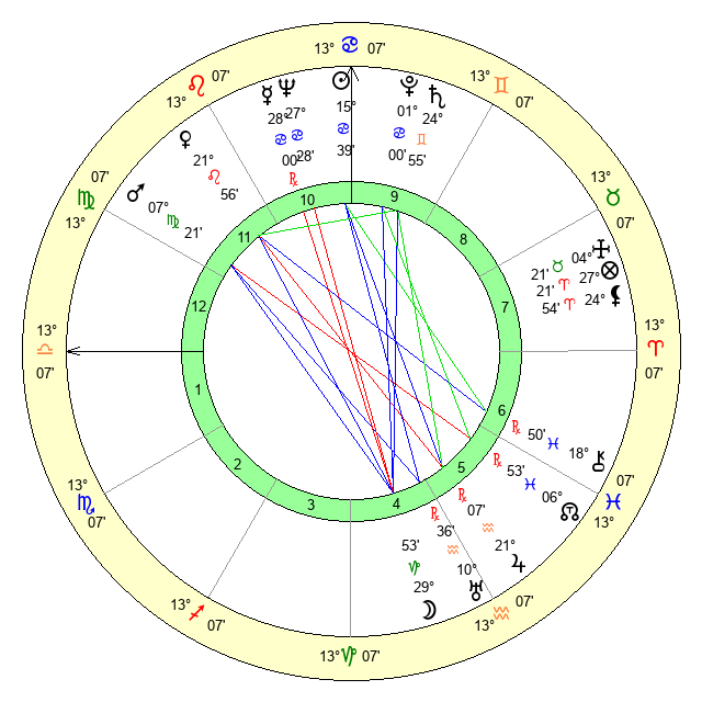 | Neptune | 27 Cancer 29 | 2 Aries 10 | 0 Leo 27 |