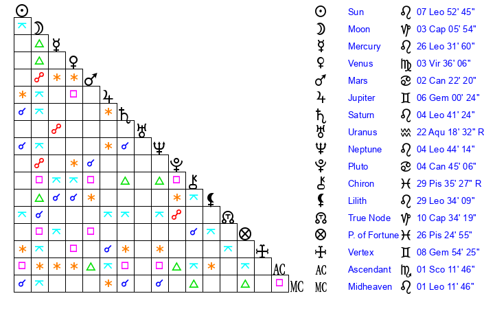 | Mercury | 26 Leo 32 | 9 Leo 12 | 1 Sagittarius 16 |