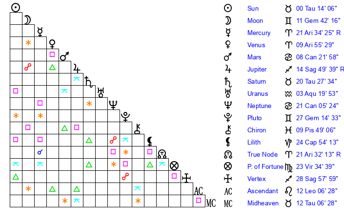 Sun | 0 Taurus 14 | 0 Taurus 52 | 18 Leo 37 |