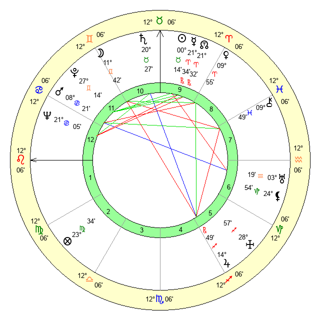 Venus | 9 Aries 56 | 25 Pisces 45 | 28 Leo 44 |