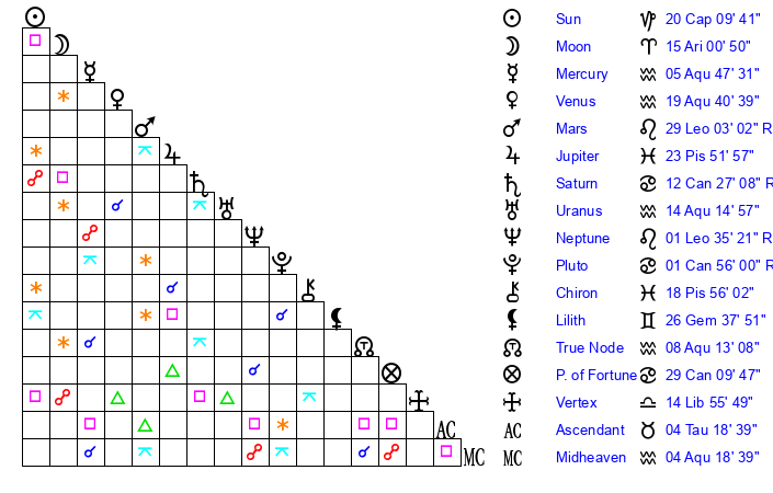 | Moon | 15 Aries 3 | 23 Gemini 27 | 8 Aries 54 |