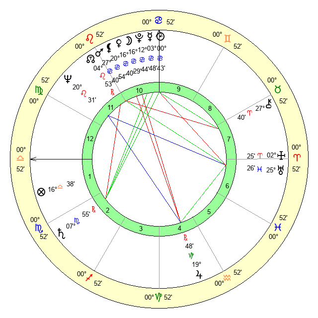 | Moon | 16 Cancer 27 | 23 Taurus 52 | 16 Pisces 45 |