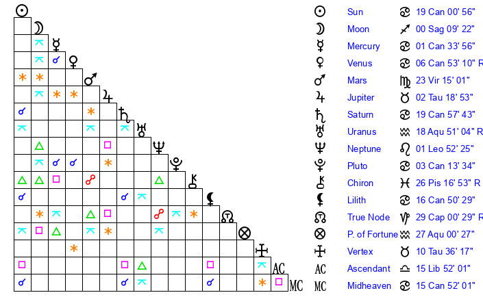 | Sun | 19 Cancer 0 | 19 Cancer 38 | 4 Scorpio 57 |