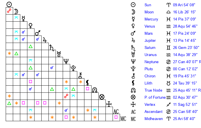 | Moon | 16 Libra 26 | 12 Taurus 59 | 23 Libra 39 |