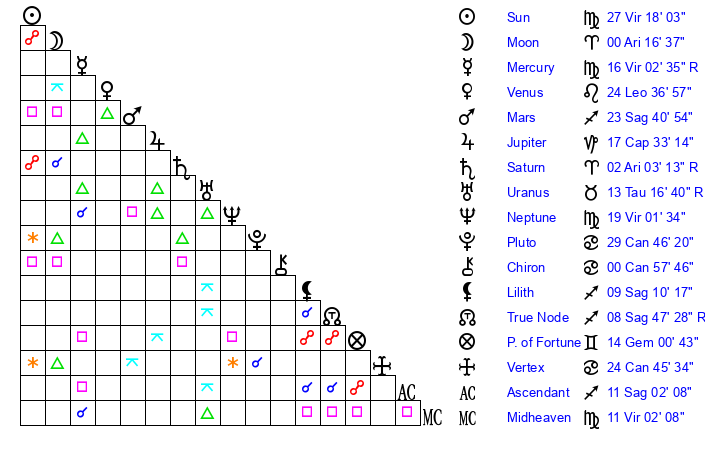| Moon | 0 Aries 11 | 14 Virgo 58 | 24 Gemini 15 |