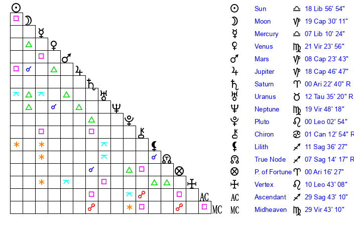 | Sun | 18 Libra 56 | 19 Libra 37 | 17 Capricorn 46 |