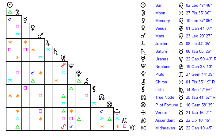 | Moon | 27 Pisces 33 | 27 Leo 48 | 19 Gemini 19 |