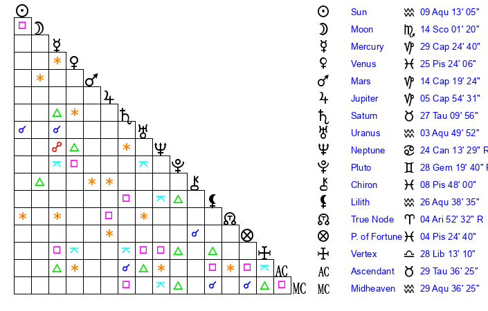 Moon | 13 Scorpio 57 | 12 Aquarius 20 | 17 Sagittarius 44 |