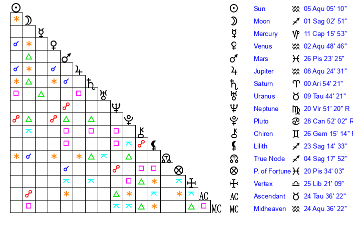 | Sun | 5 Aquarius 5 | 5 Aquarius 59 | 1 Taurus 54 |