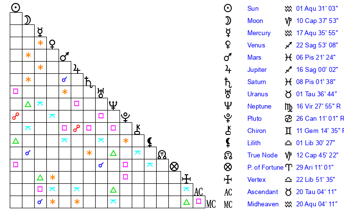 | Sun | 1 Aquarius 30 | 2 Aquarius 56 | 0 Taurus 25 |