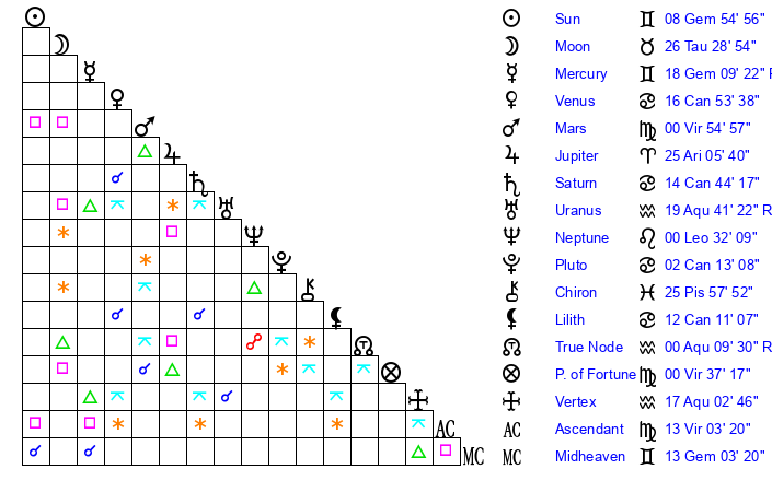 | Mercury | 18 Gemini 8 | 10 Gemini 12 | 18 Libra 52 |