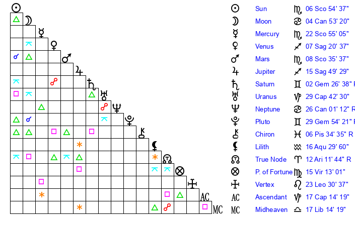 Sun | 6 Scorpio 55 | 7 Scorpio 46 | 0 Pisces 28 |