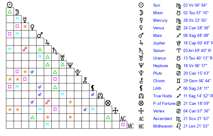 | Neptune | 18 Virgo 6 | 1 Aries 28 | 20 Virgo 52 |