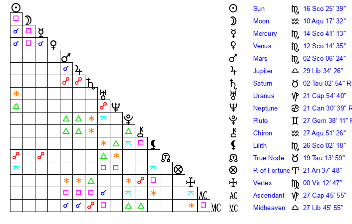 | Venus | 12 Scorpio 15 | 27 Sagittarius 32 | 5 Aries 5 |