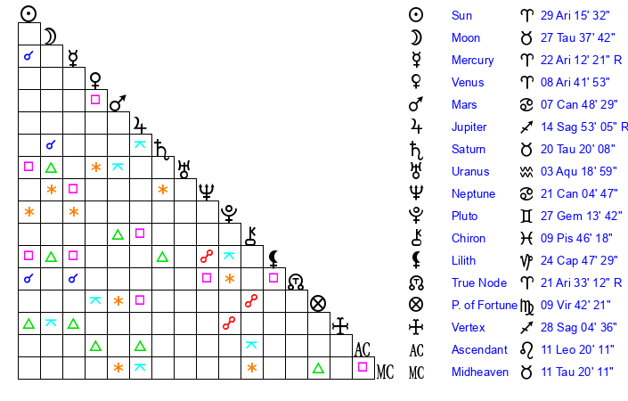 Pluto | 27 Gemini 14 | 3 Aquarius 45 | 29 Gemini 37 |