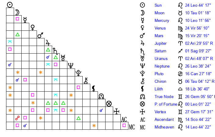 | Sun | 24 Leo 44 | 26 Leo 0 | 1 Sagittarius 26 |