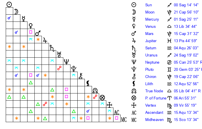 | Venus | 13 Libra 34 | 14 Capricorn 10 | 4 Pisces 57 |