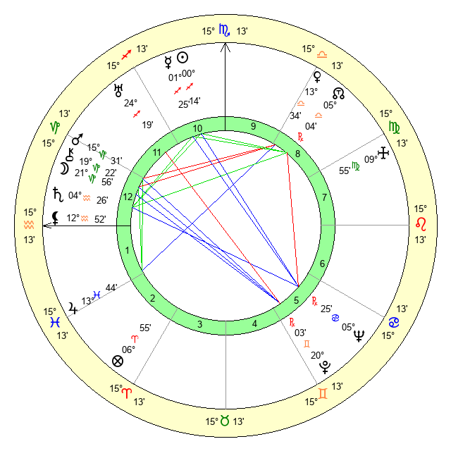 | Moon | 22 Capricorn 3 | 9 Virgo 8 | 17 Gemini 41 |