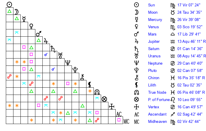 | Sun | 17 Virgo 7 | 18 Virgo 14 | 8 Capricorn 10 |