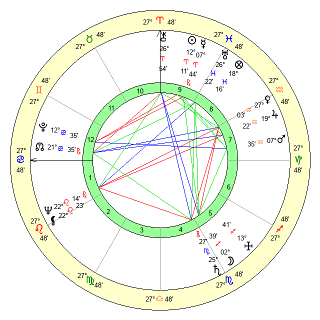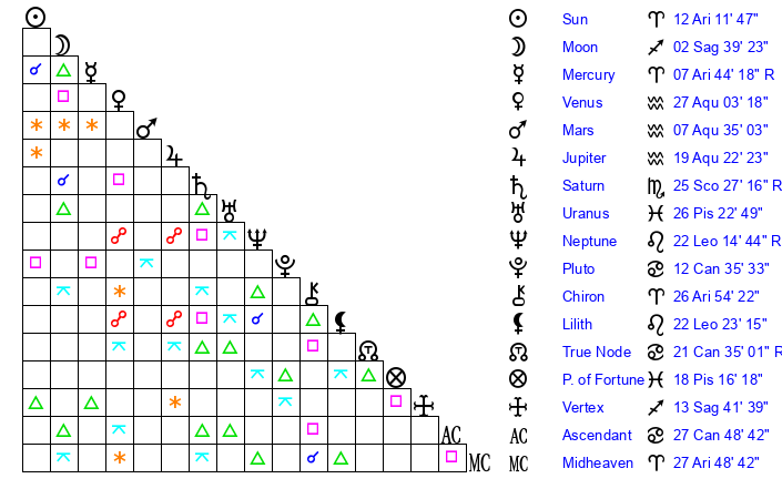 | Moon | 2 Sagittarius 41 | 12 Gemini 27 | 25 Cancer 55 |
